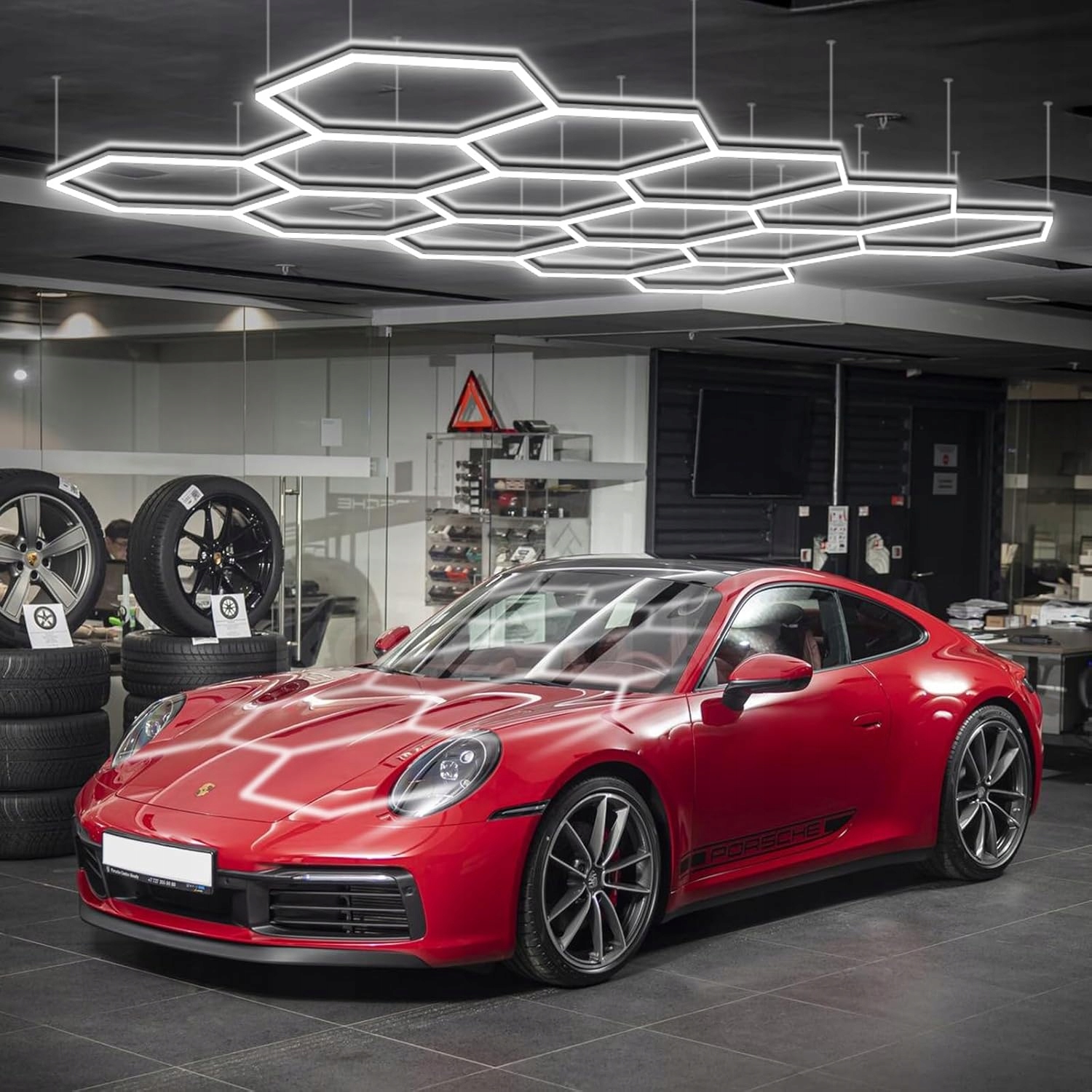 System oświetleniowy HEXAGON LED w kształcie plastra miodu to połączenie najwyższej wydajności świetlnej z designerskim stylem. Idealny do warsztatów, garaży, studiów detailingowych, barbershopów czy showroomów.
