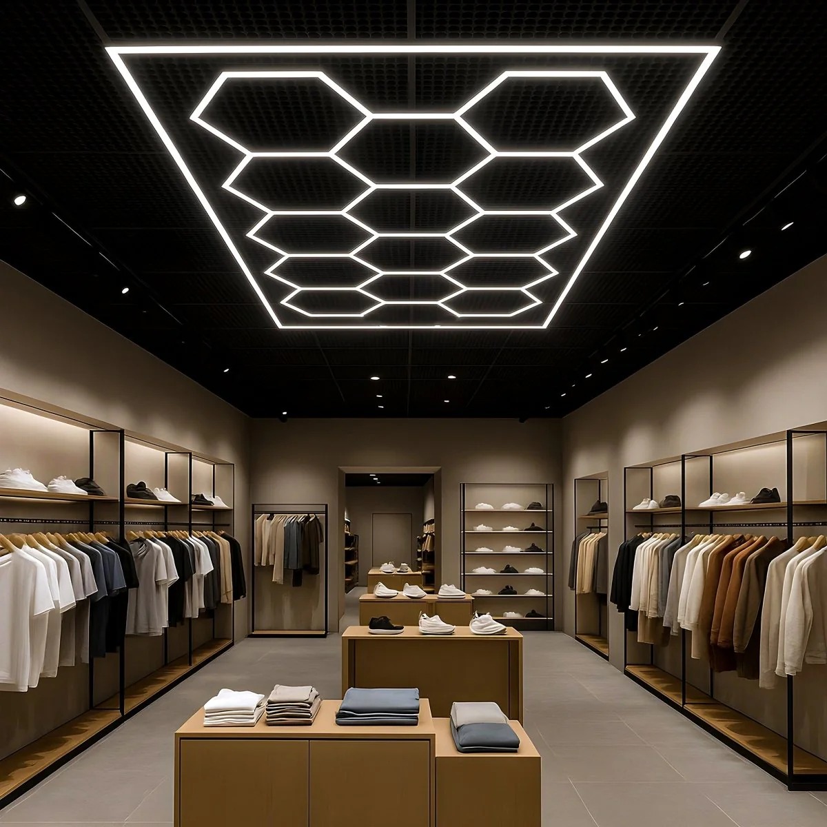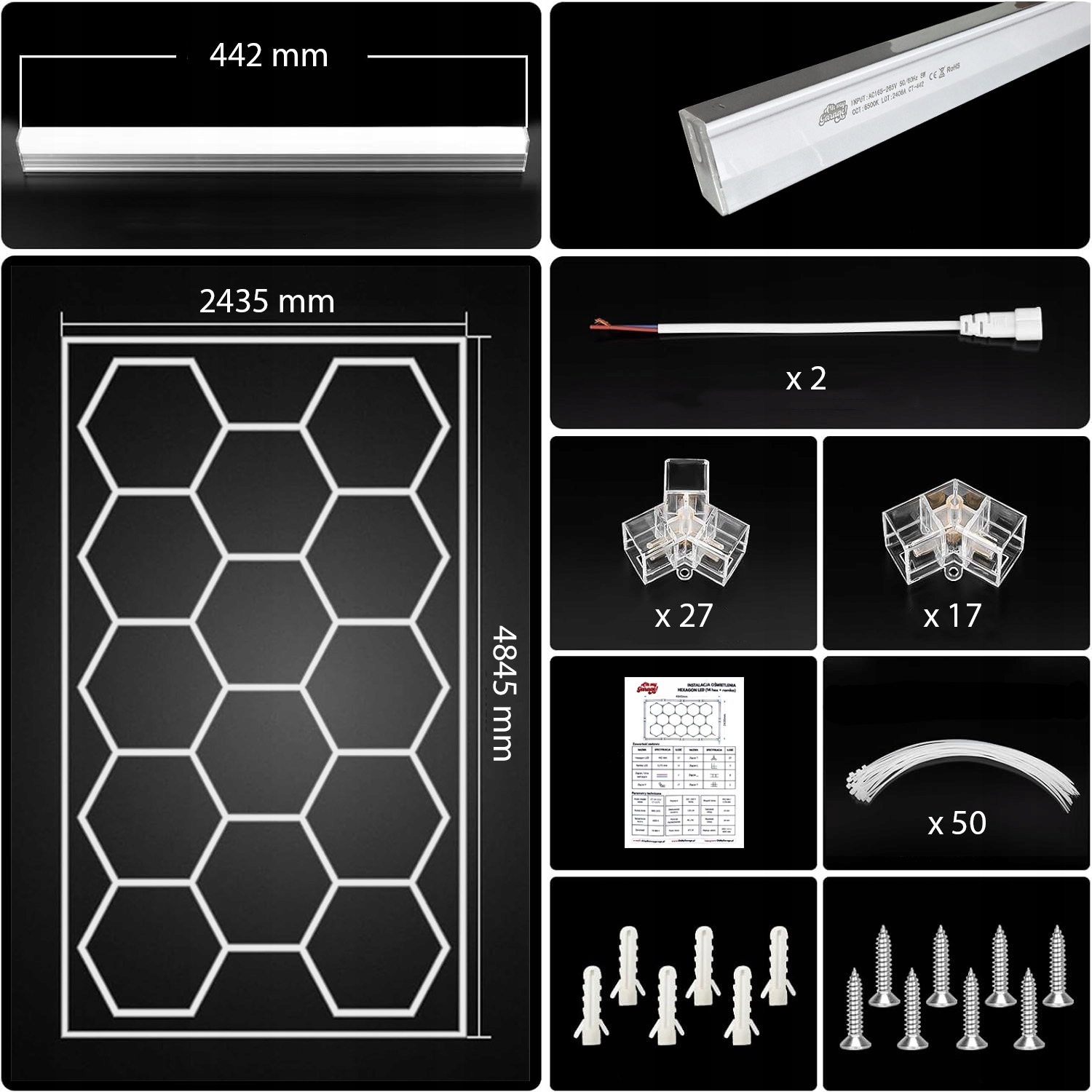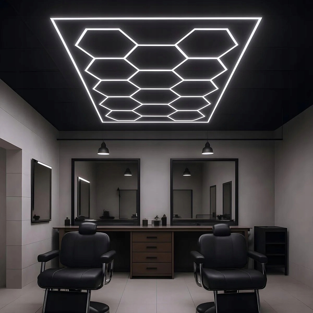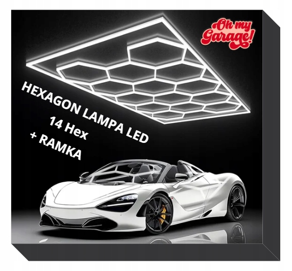 System oświetleniowy HEXAGON LED w kształcie plastra miodu + rama to połączenie najwyższej wydajności świetlnej z designerskim stylem. Idealny do warsztatów, garaży, studiów detailingowych, barbershopów czy showroomów.