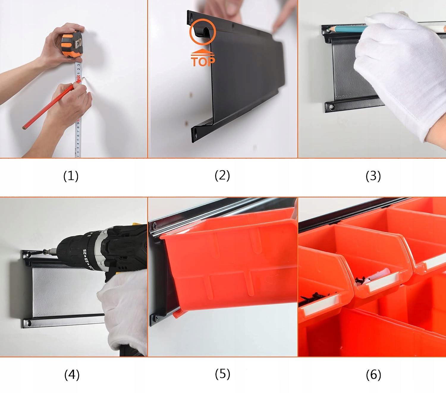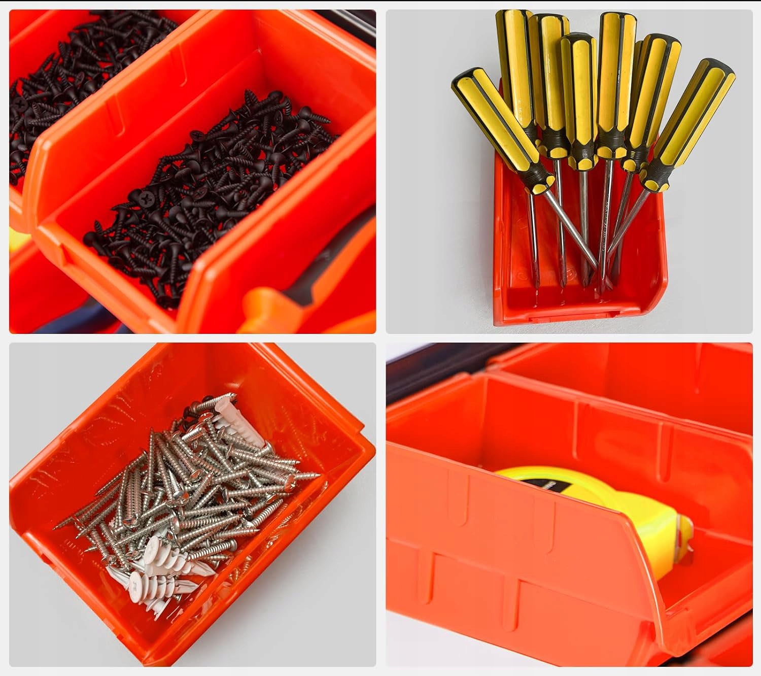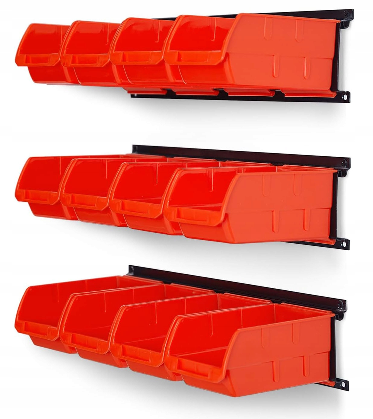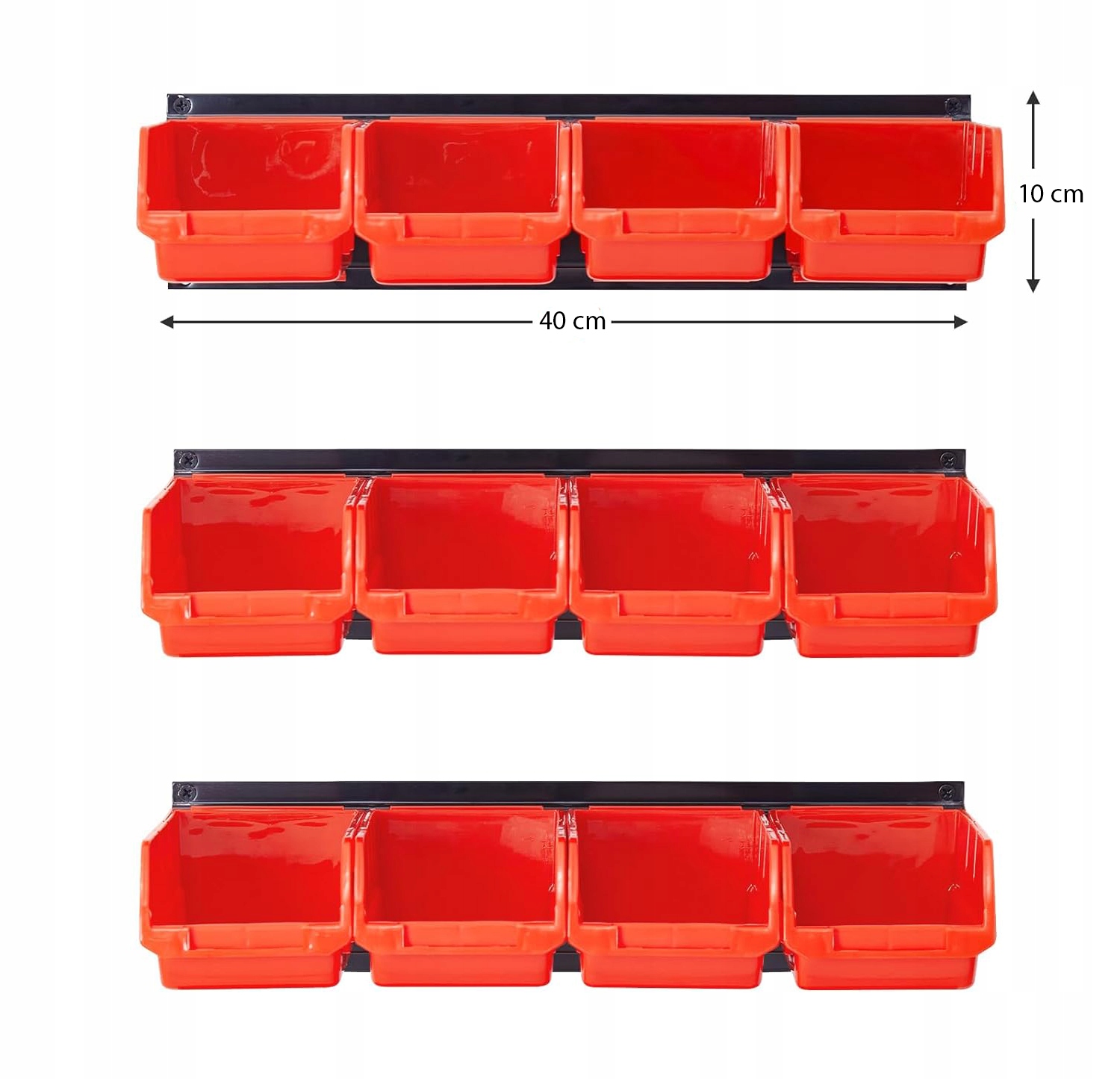 Zestaw zawiera 12 kuwet, idealnych do przechowywania narzędzi, akcesoriów, śrub, nakrętek, gwoździ, przyborów biurowych czy materiałów do rękodzieła. Kuwety są zdejmowane i mogą być łatwo przestawiane na szynach, co umożliwia dostosowanie przestrzeni do indywidualnych potrzeb.