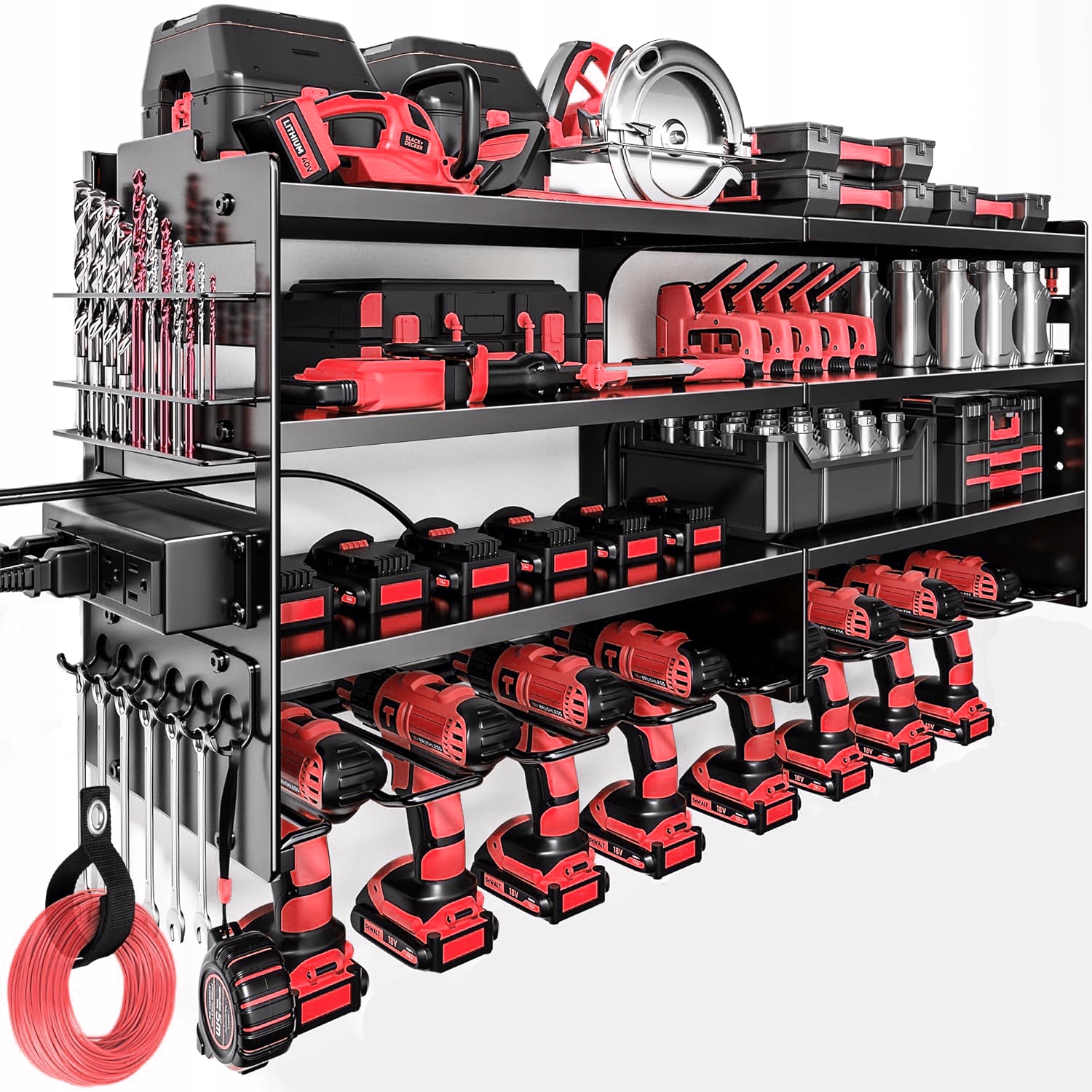 - 4 poziomy półek + 8 uchwytów na wiertarko-wkrętarki