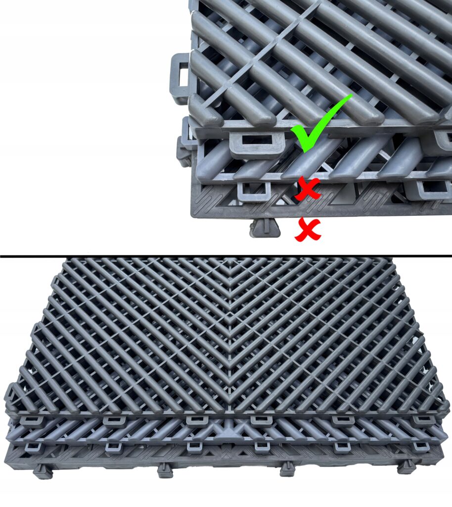 W odróżnieniu od niektórych płytek z poprzecznymi wzmocnieniami na całej powierzchni, które blokują nieczystości, nasze płytki zostały zaprojektowane tak, aby umożliwiały swobodne przedostawanie się wody i brudu podczas mycia wodą lub sprężonym powietrzem.