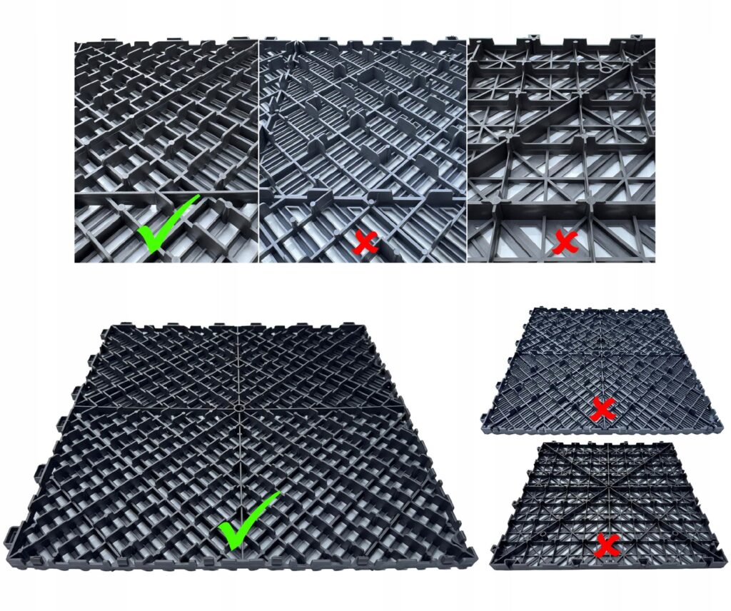 W przeciwieństwie do wielu konkurencyjnych produktów, nasze płytki mają gęstą siatkę plastikowych podpór, które równomiernie rozkładają nacisk i zapewniają wyjątkową trwałość nawet przy intensywnym użytkowaniu.